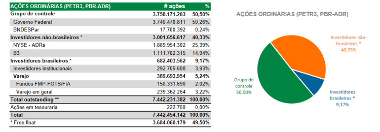 Sendo assim a união detêm, no caso da Petrobras, atualmente 50,50% das ações ordinárias da empresa. Podemos ver no gráfico a seguir a atual distribuição acionária da Petrobras: